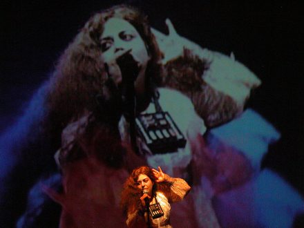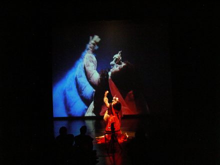 Bustamante’s character transforms, via video, from a gentle princess who has lost her puppy in a lush fall forest into an icy nefarious hag trudging through the snow. The theme of change and metamorphosis, in the tradition of Ovid and Kafka, is explored in the female corpus and in this case, the Hag and the Heroine. In live performance, as the hag, Bustamante takes the audience on a bizarre journey, Frankensteining a patchwork of fables to create a meandering and warped morality tale. Hero interrogates the idea of myth, fantasy, and primordial archetypes in the modern world. Hero is storytelling from a cinematic perspective. Hero is contemporary and aware, without being didactic.
